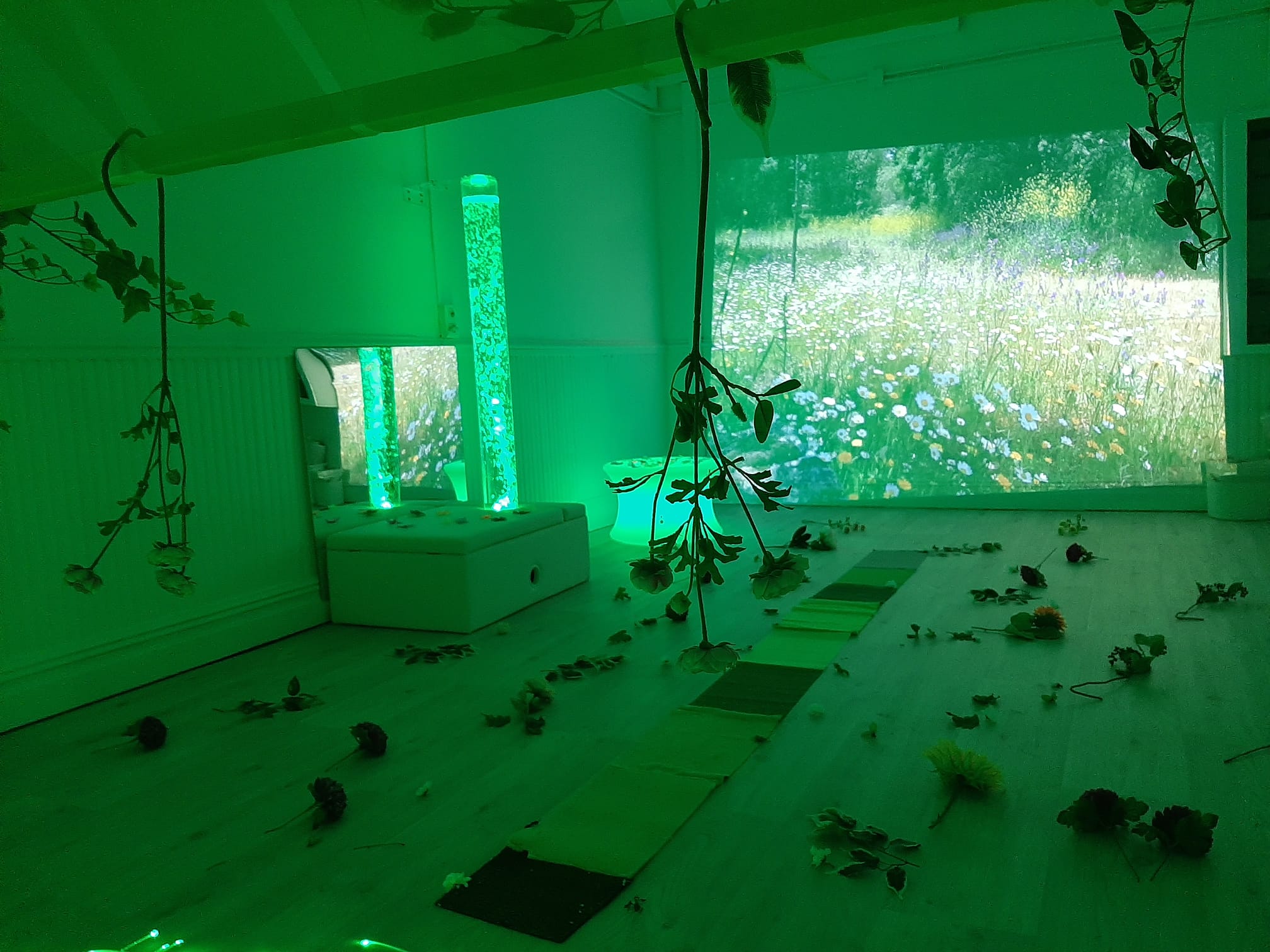 El aula se ha diseñado siguiendo las pautas que marca la ISNA (International Snoezelen Association). Combinando proyecciones luminosas, diferentes texturas y sonidos tranquilizadores, se ha convertido en un refugio respetuoso con el ritmo y las necesidades de cada alumno/alumna. Las propuestas sensoriales se organizan en función de los temas, ofreciendo al alumnado realidades sensoriales múltiples: los colores de primavera, el sonido de las hojas de otoño, la tranquilidad submarina o los misterios del sistema solar pueden ser desvelados en ella.